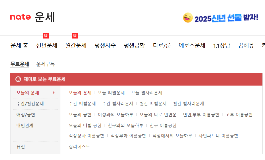 네이트 운세는 띠별 운세, 궁합, 심리 테스트 등 다양한 주제를 제공합니다. 특히 심리 테스트를 통해 재미 요소를 더하며, 추천 운세 자료도 풍부합니다.